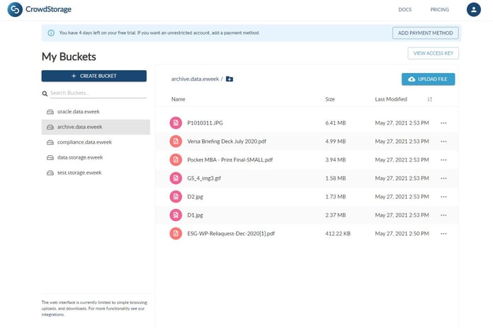 Once storage buckets are established, users can leverage CrowdStorage’s S3 compatibility. The company offers integration with numerous applications and makes it is quite easy to create access keys to protect data. Integrations (via S3) are offered for numerous applications, including most of AWS SDKs, meaning that custom software developed using those SDKs can also access storage buckets.