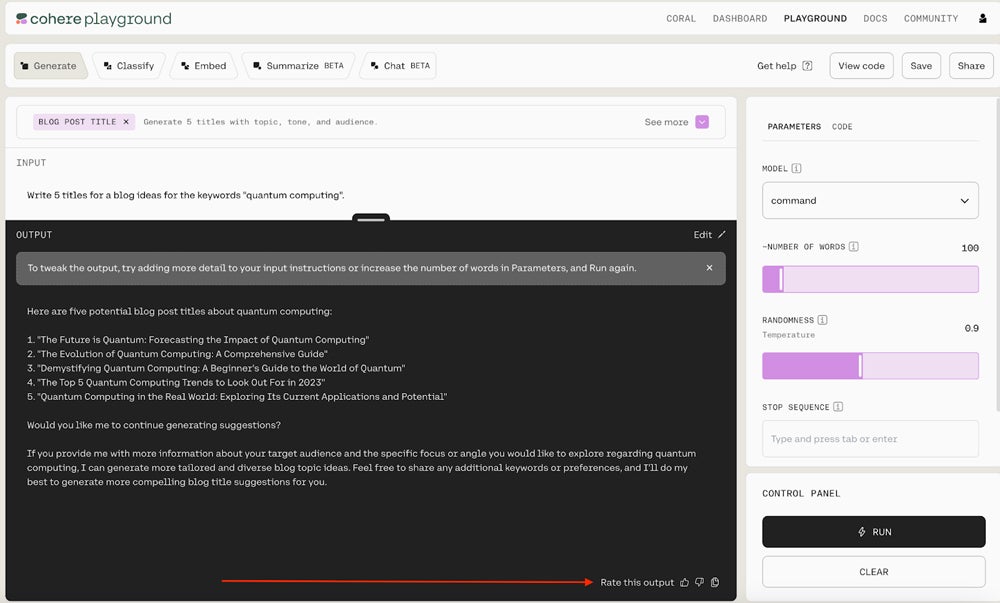 | User-friendly Cohere Playground. | Users complain about occasional bugs and output oddities. |