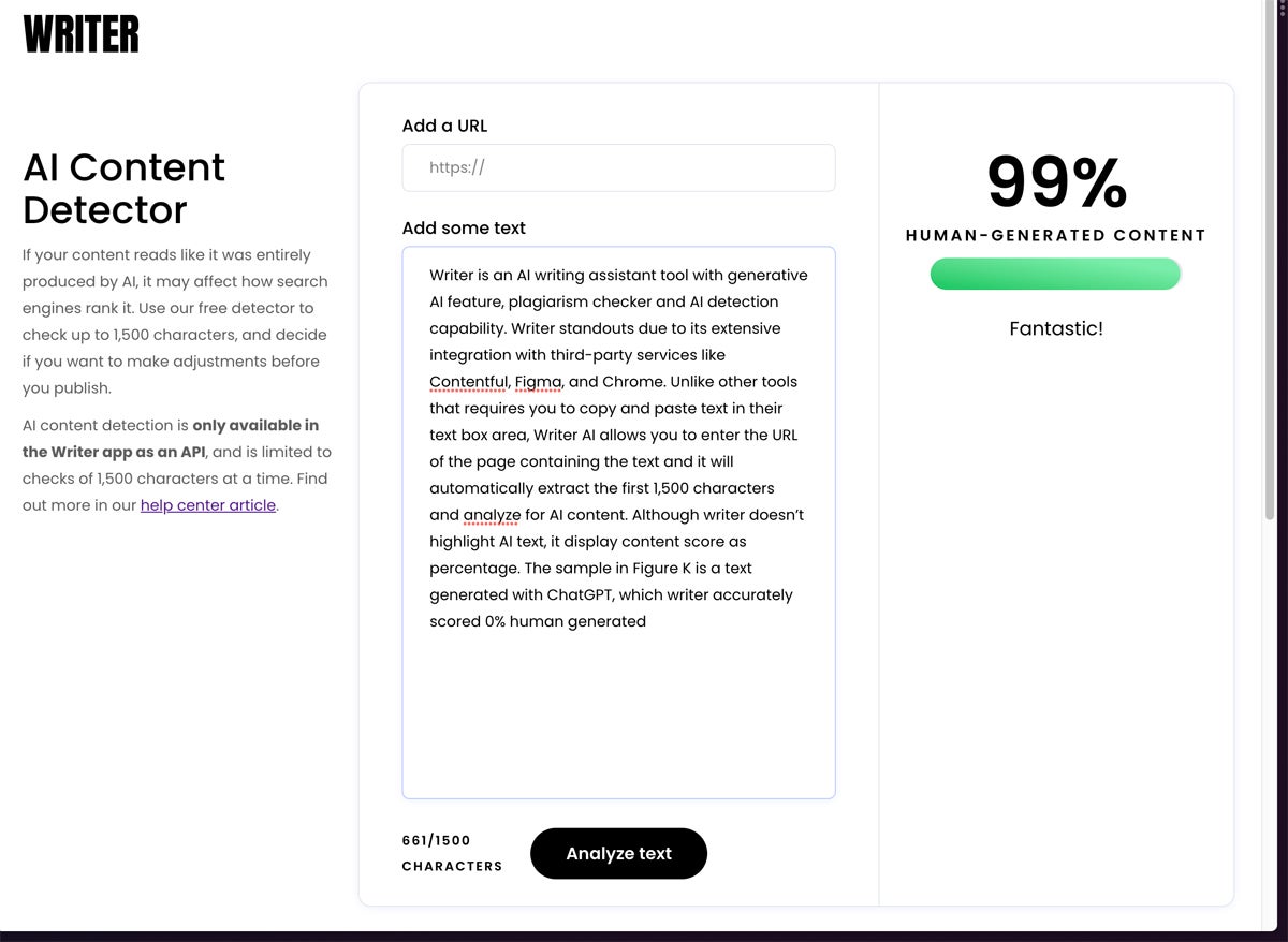 | Writer AI Content Detector | Integration | Yes | No | No | Yes | Yes | $18 per user per month |